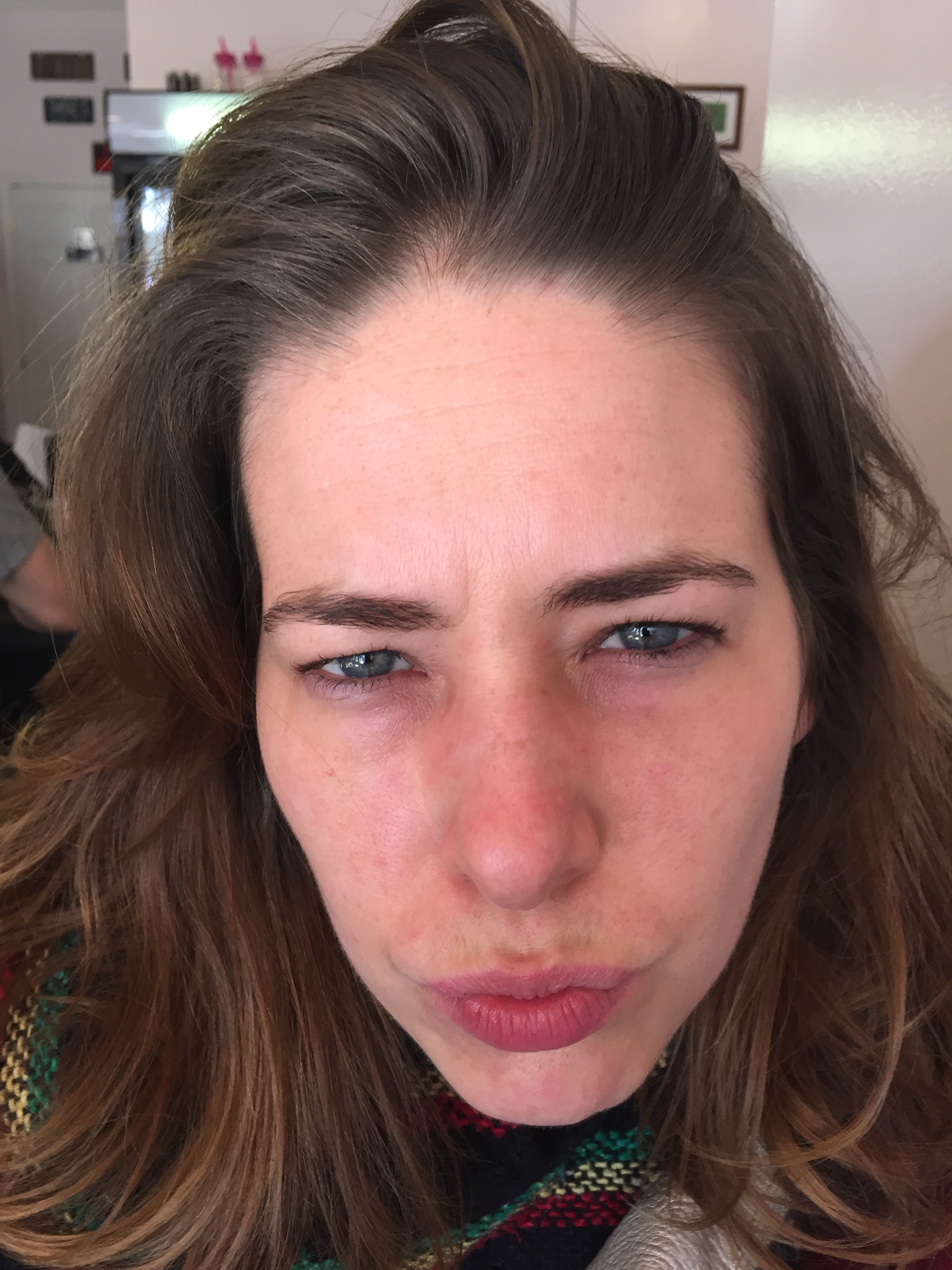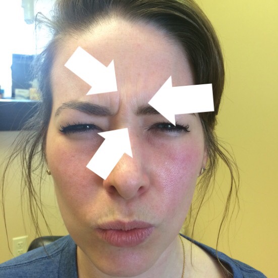 I am struggling to make this face. At this stage, I’ve come to realize just how much I furrow my brow on a daily basis and how much tension is stored there, sometimes causing me headaches. Because it’s harder for me to furrow my brow, my face feels less tense. It’s almost like a weight has been lifted — a positive experience I wasn’t expecting.